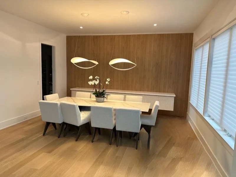 This dining space blends modern design with warmth, featuring a natural wood dining table surrounded by light-textured chairs. The back wall, clad in rich wood, anchors the space, while elongated oval pendant lights add an artistic touch.