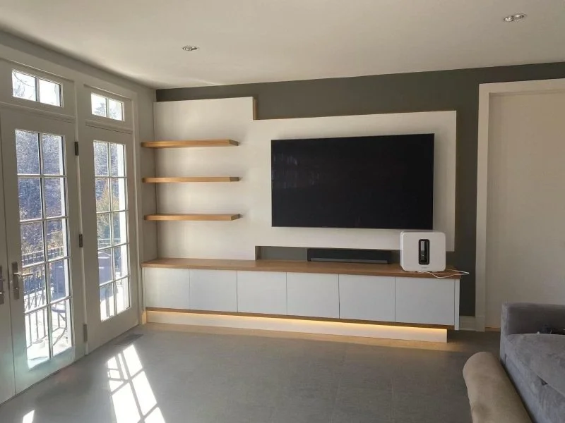 The wall-mounted media unit blends minimalist white cabinetry with warm wooden accents, offering a modern yet inviting look. Floating shelves provide display space, while accent lighting adds a cozy ambiance.